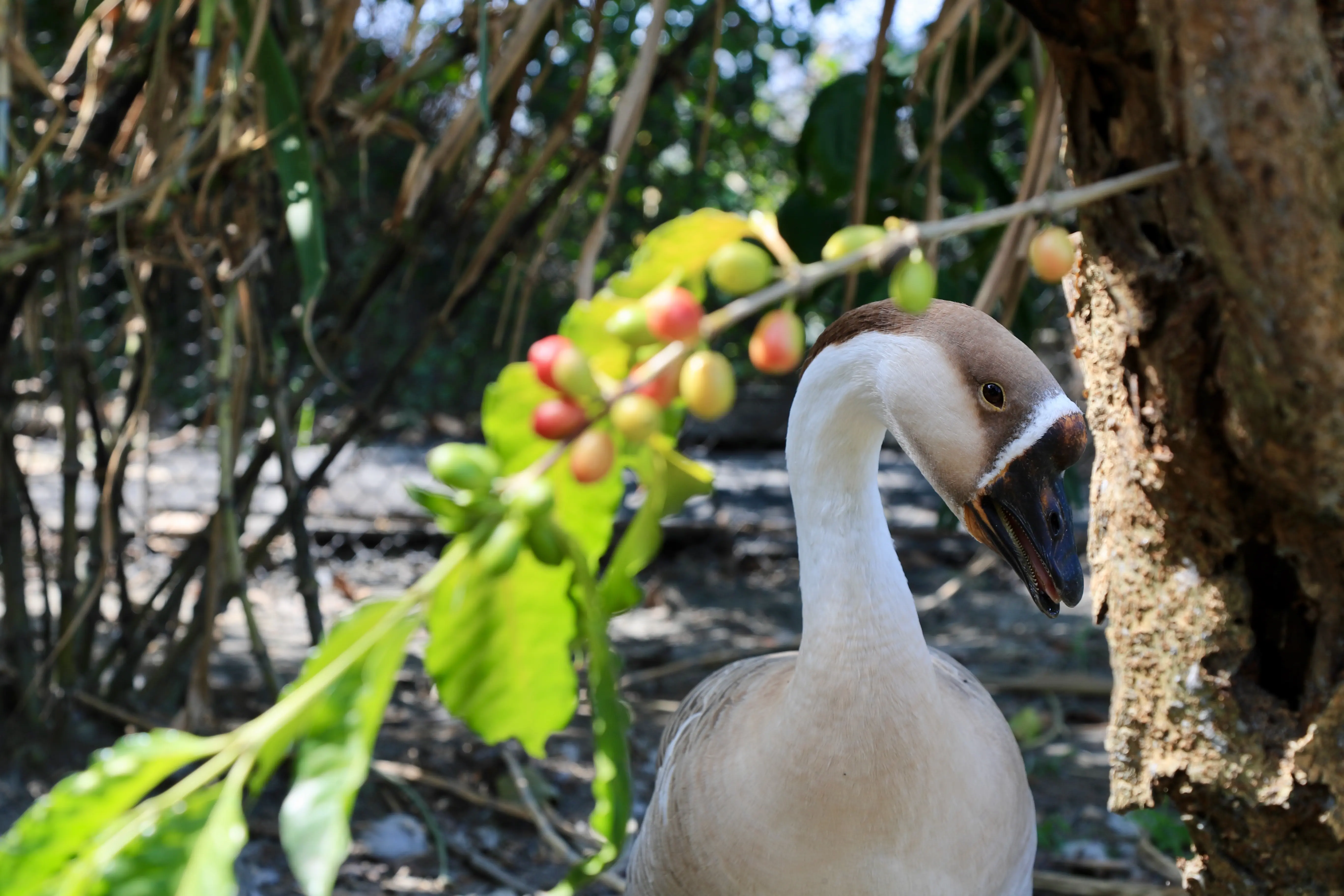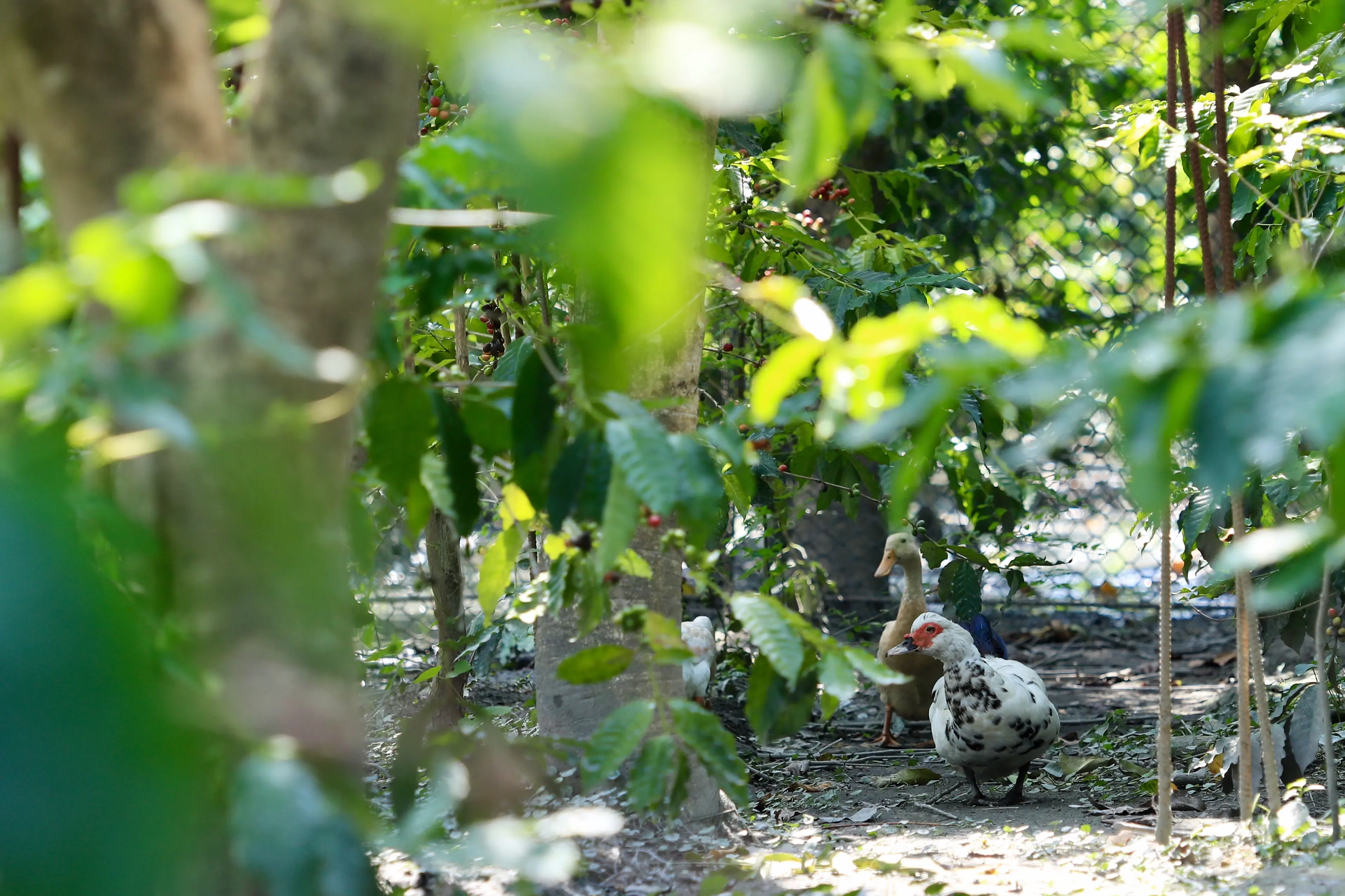 目前園區約有咖啡樹700多株,鴨子員工80多隻,同時有10多隻大白鵝隊長,以及12隻特種部隊獅頭鵝,將近百隻天天會幫忙施肥、趕蛇、吃害蟲。由於園區環境天然無藥,後來也有朋友邀請在咖啡樹間代養黃金土雞,不過,黃金土雞就沒那麼好命,賣蛋也要賣身,每隻900元的窯烤咖啡土雞也是田園祕境招牌菜。