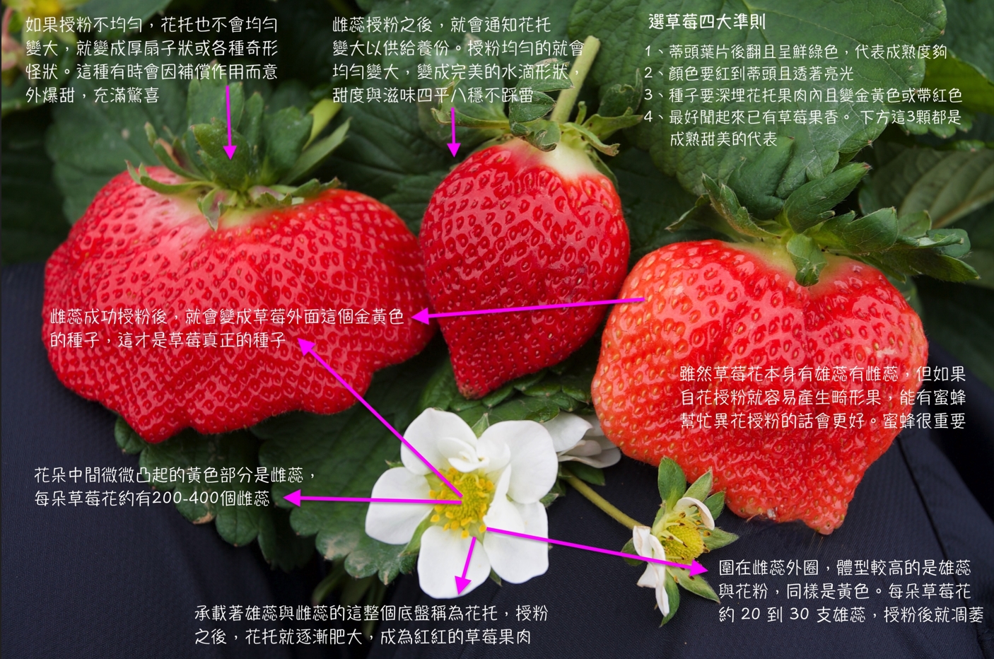 簡單來說,我們所看到的紅通通草莓,其實不是它的果實,而是它肥大的花托,真正的種子是在草莓最外頭那一顆顆像芝麻的東西。通常草莓雌花在成功授粉後,就會通知花托變大來供給它養份變種子。也就是,如果遍佈上頭的種子授粉狀況均勻或都能異花授粉,就會變成完美水滴狀;如果授粉狀況不均勻或自花授粉,有授粉成功的部分會膨大、授粉不成功的地方不膨大,最後就會變成奇形怪狀。因此草莓外型,反映的就是蜜蜂有沒有努力幫草莓花授粉的成績單。草莓花與草莓的構造,以及如何挑選草莓,可參見底下圖片