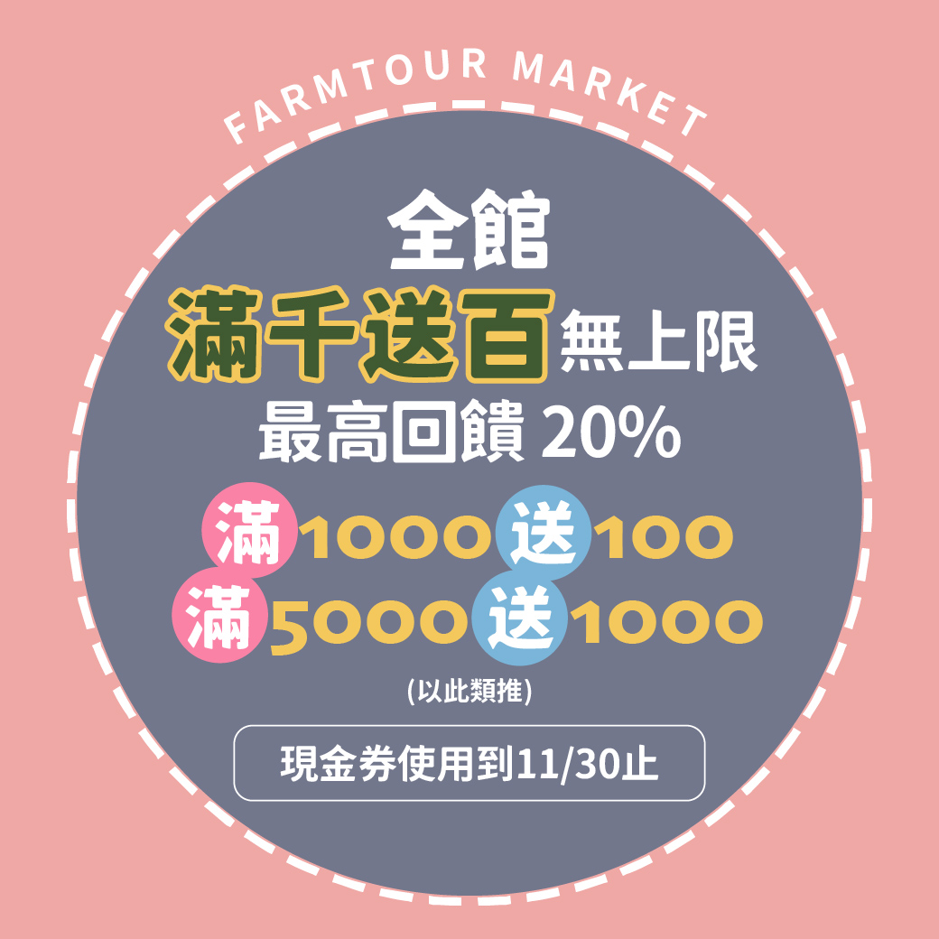 - 單筆結帳金額滿$1000元送$100,滿$2000元送$200 …,滿$5000元送$1000農遊現金券,以此類推。