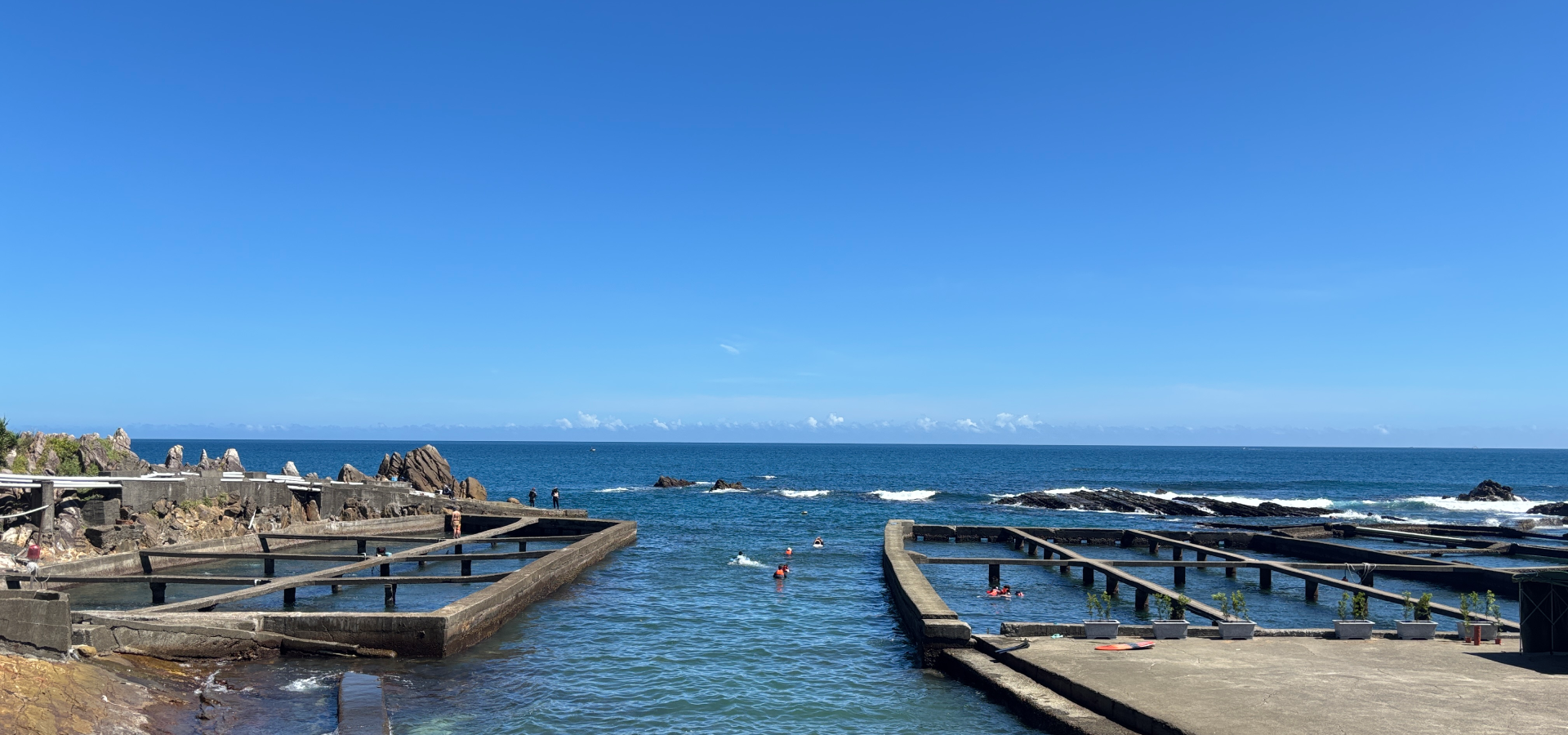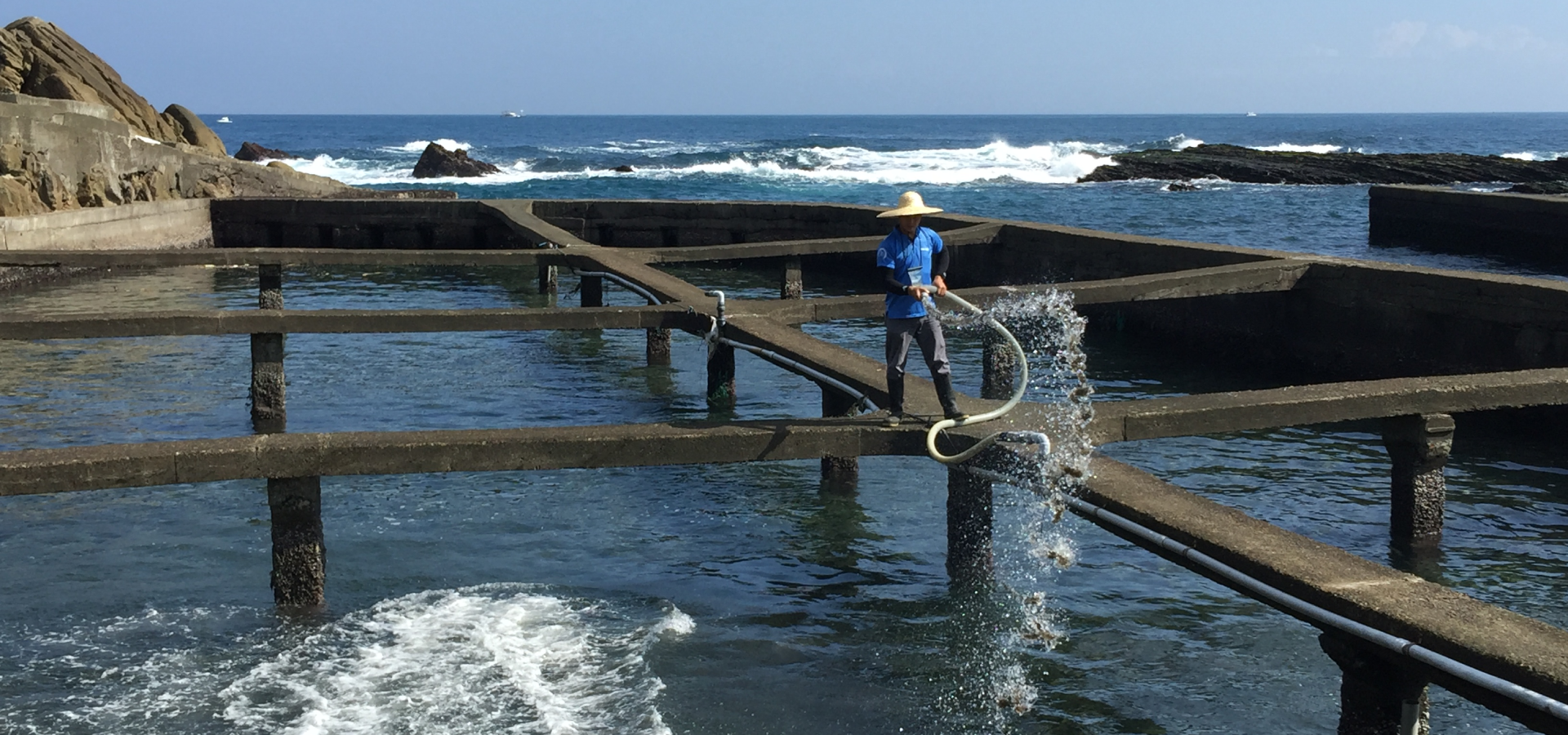 台2線濱海公路旁,湛藍的天空下,海水潮來潮往,「鮮物本舖」的九孔養殖池與東北角的礁岩、大海連成一氣。